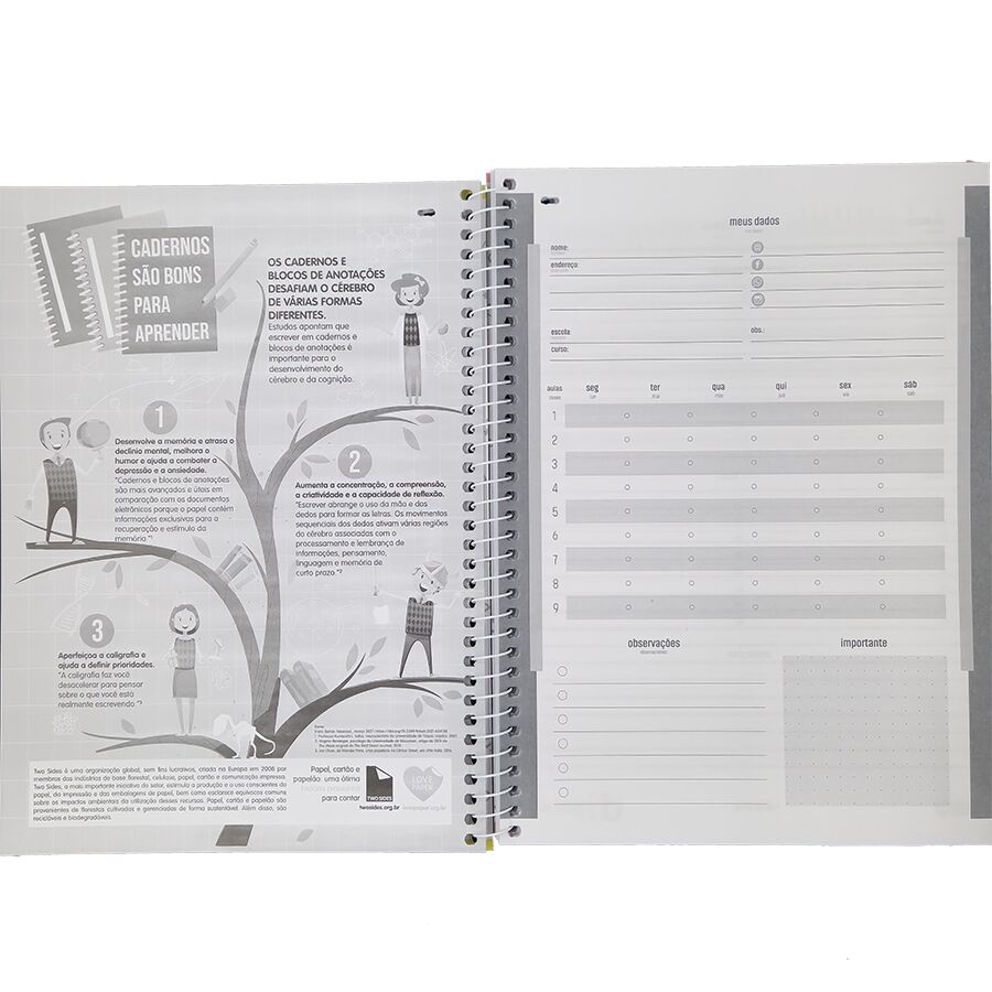 Suas folhas de 56 g/m² possuem textura suave e evitam o vazamento de tinta, tornando a escrita mais agradável e organizada.