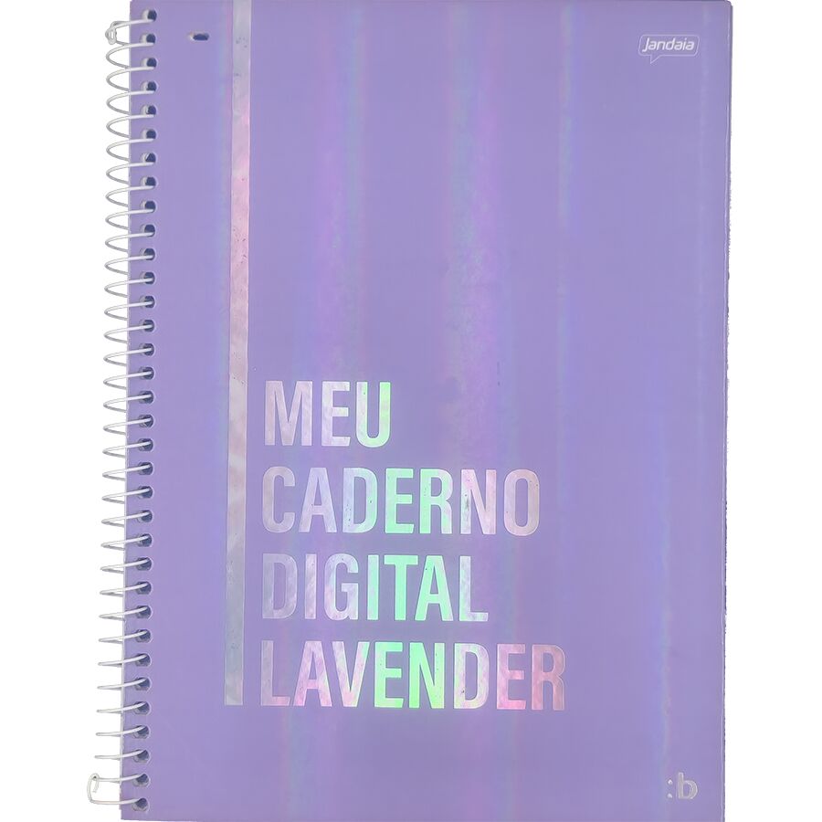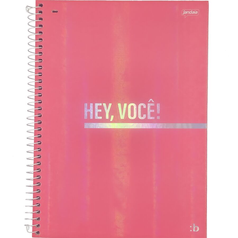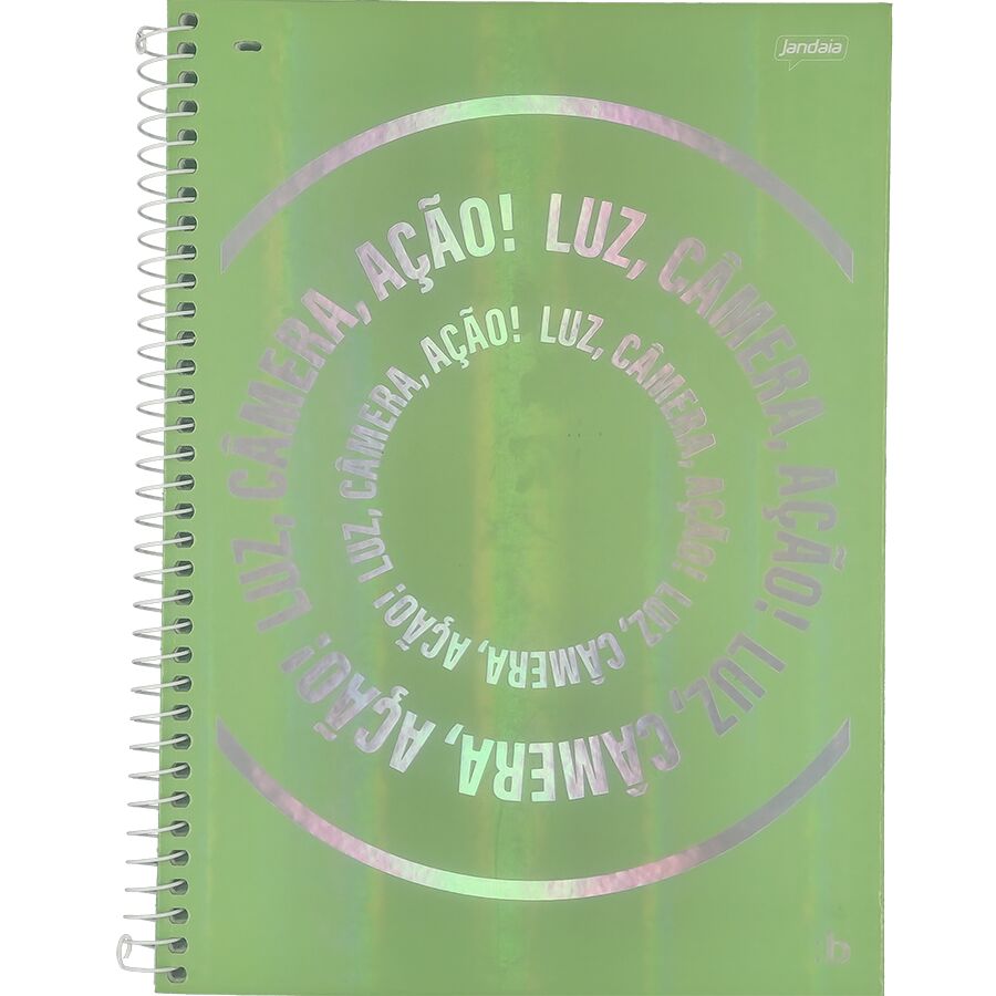 🖼️ Alt-text (SEO): Caderno Bright 80 Folhas Jandaia com capa holográfica metalizada disponível nos modelos Lavender, Luz Câmera Ação, Você é Ouro e Hey Você.
