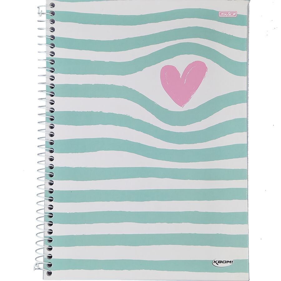 A capa do caderno-sao-domingos-kbom-1-materia é charmosa e minimalista, com listras verdes suaves e um coração rosa ao centro.