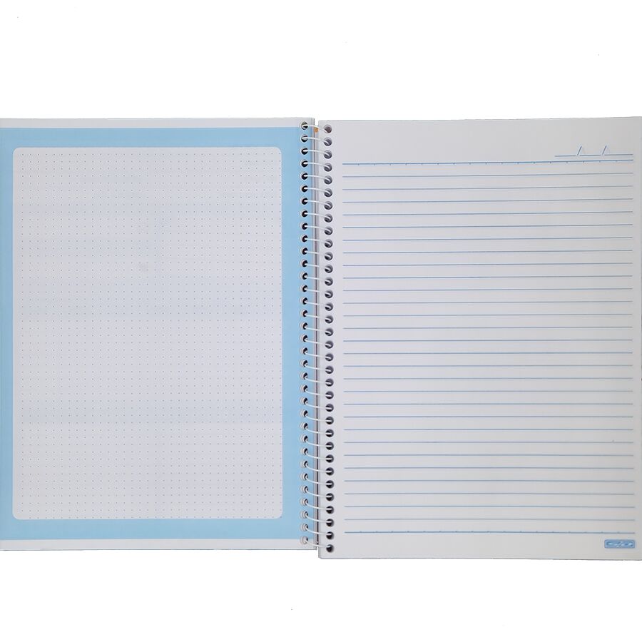 O acabamento em espiral metálico prateado facilita o manuseio e oferece maior resistência, enquanto a capa dura laminada protege o conteúdo interno e mantém o caderno sempre com aparência nova.