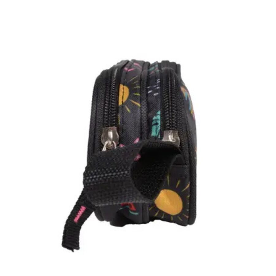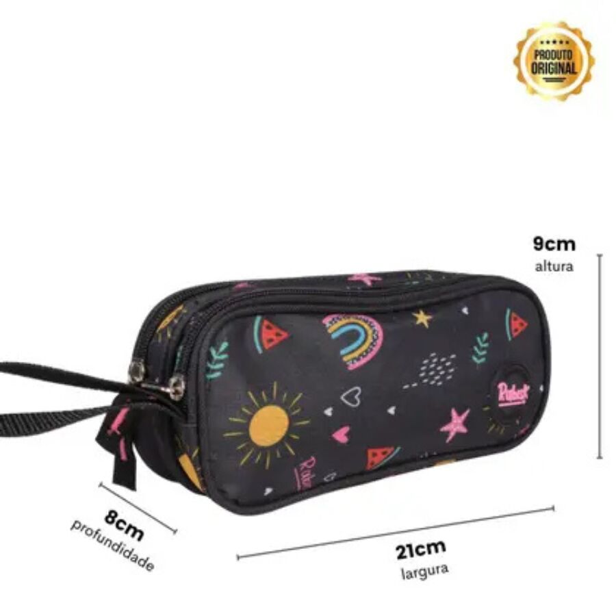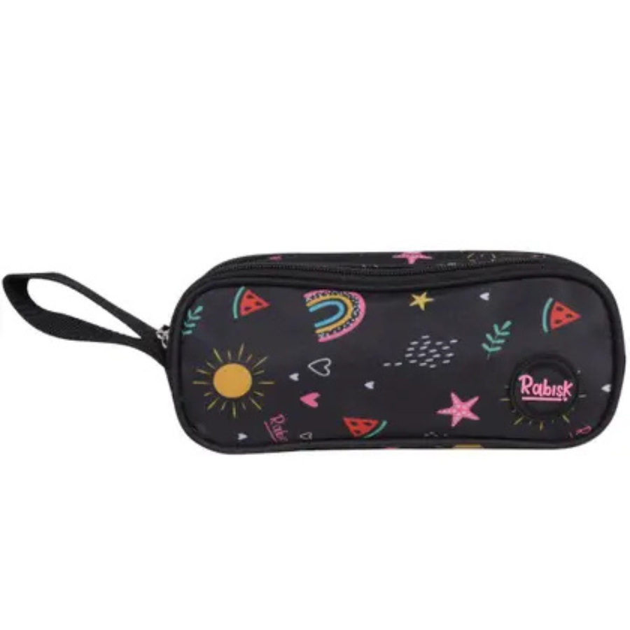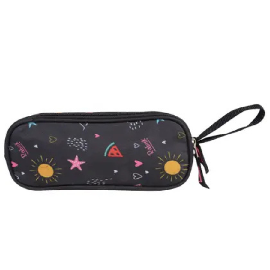 O Estojo Rabisk de verão RK2348 possui estampa divertida com elementos como sol, estrelas e melancias, dois compartimentos amplos e alça lateral reforçada. Perfeito para transportar materiais escolares com estilo e organização.