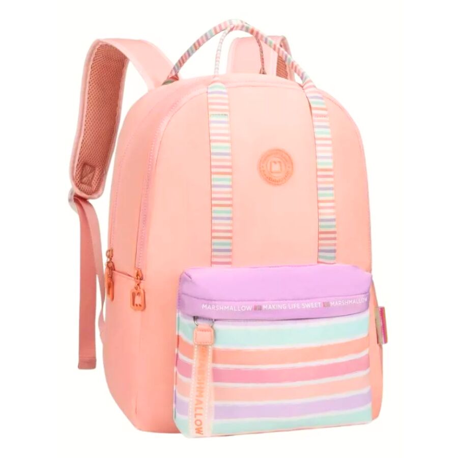 Explore a Mochila Escolar Marshmallow Making Life Sweet na cor Salmão! Feita para estudantes que desejam estilo e praticidade. Com design moderno e cores vibrantes, esta mochila é perfeita para levar todos os seus itens escolares com muito charme. Confira agora!