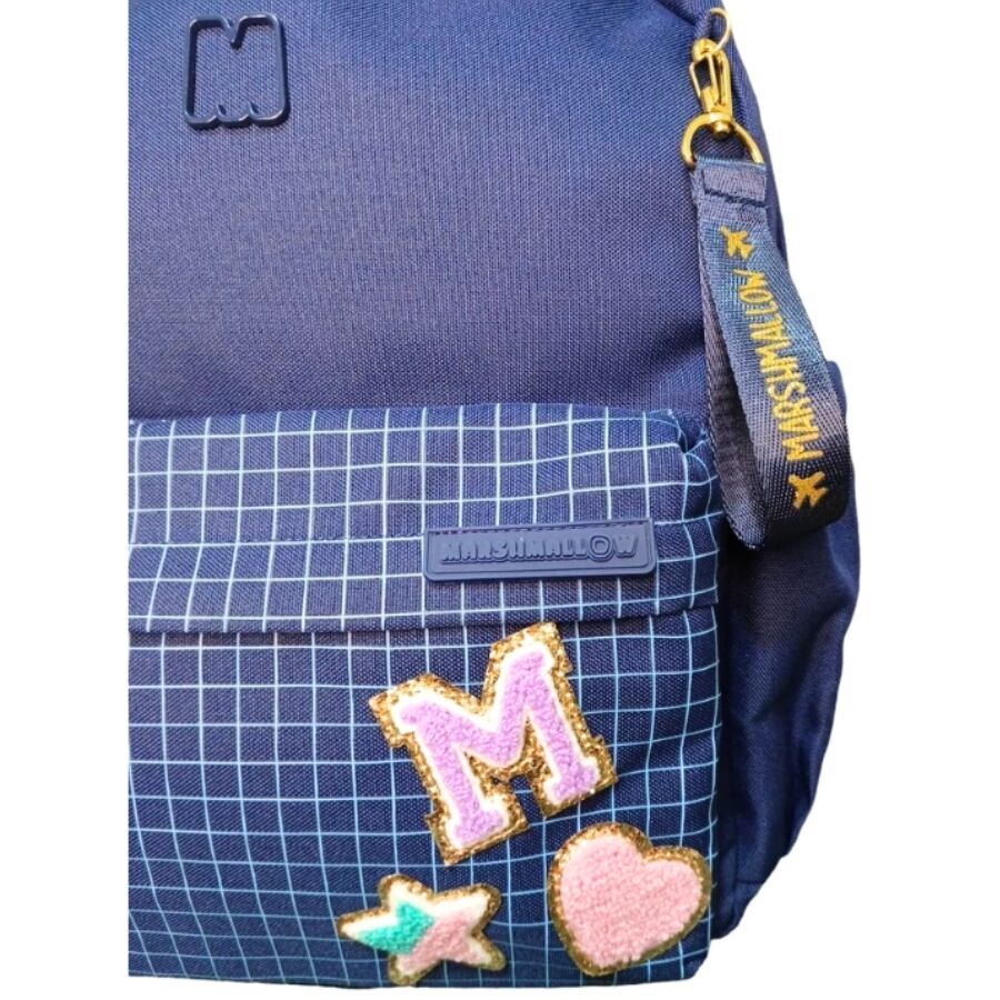 Com sua cor azul marinho elegante e os bordados coloridos em formato de letra “M”, coração e estrela, essa mochila encanta pelo estilo e pela praticidade no uso escolar e cotidiano.