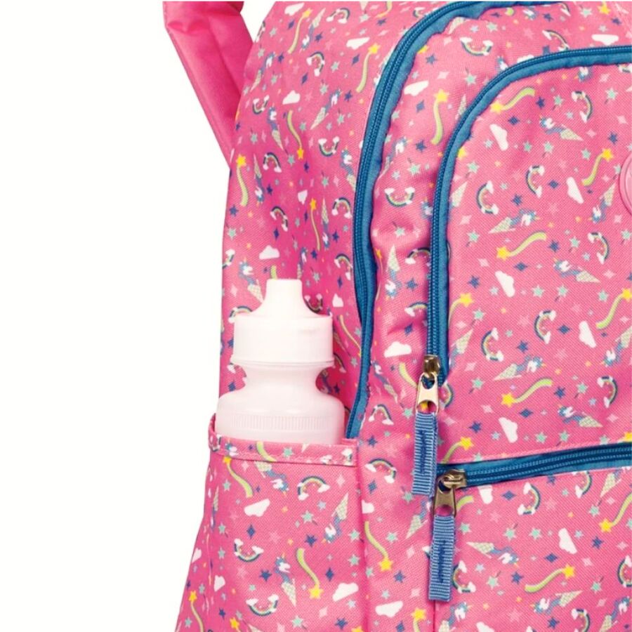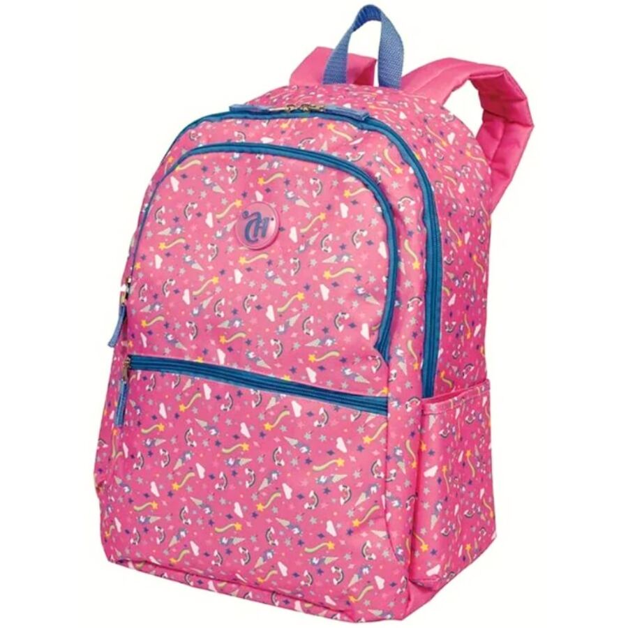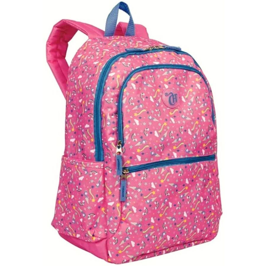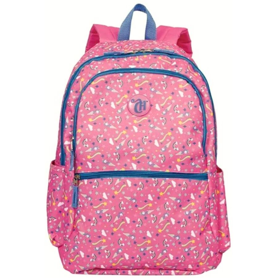 Inspirada na delicadeza e magia do universo Capricho, esta mochila combina tons de rosa vibrante, brilho sutil e estampa com unicórnios e estrelas, trazendo um visual encantador para o dia a dia escolar.