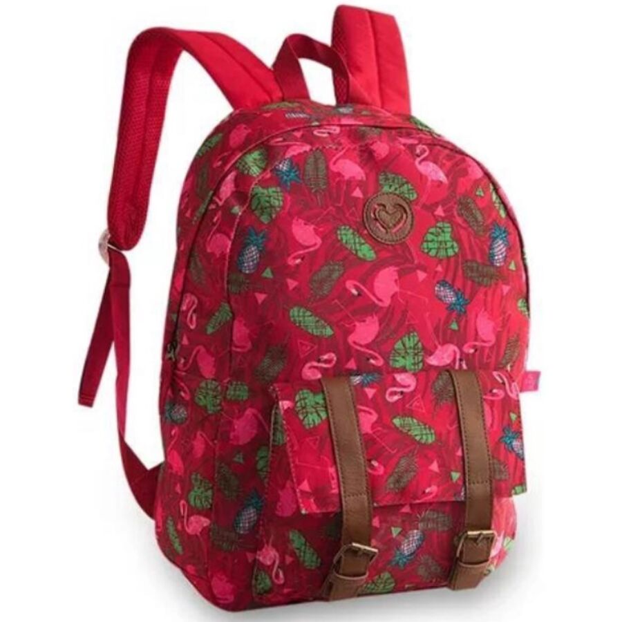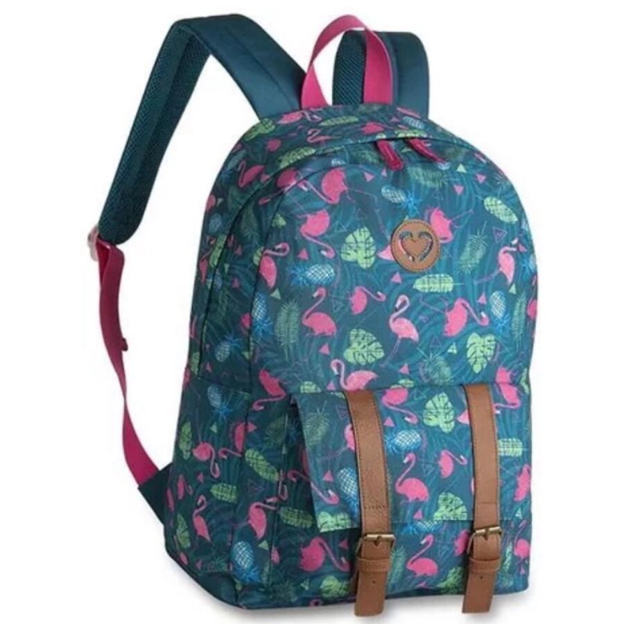 A imagem enviada mostra uma mochila escolar clio style estampada com flamingos, usando tons vivos que chamam atenção.