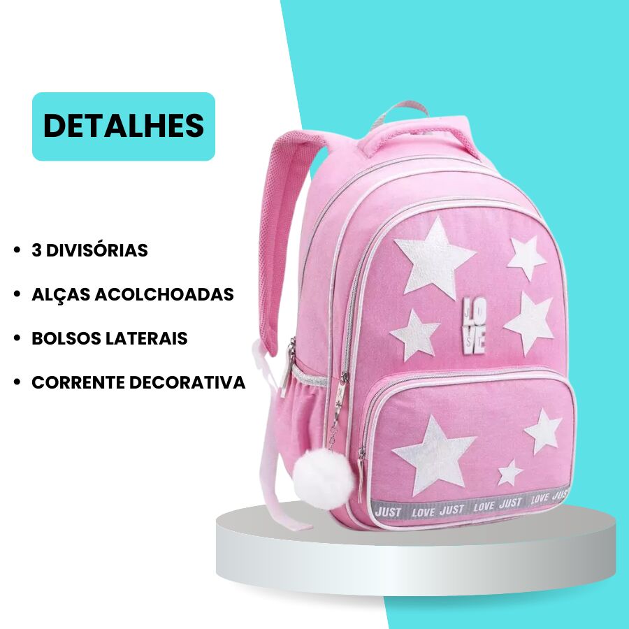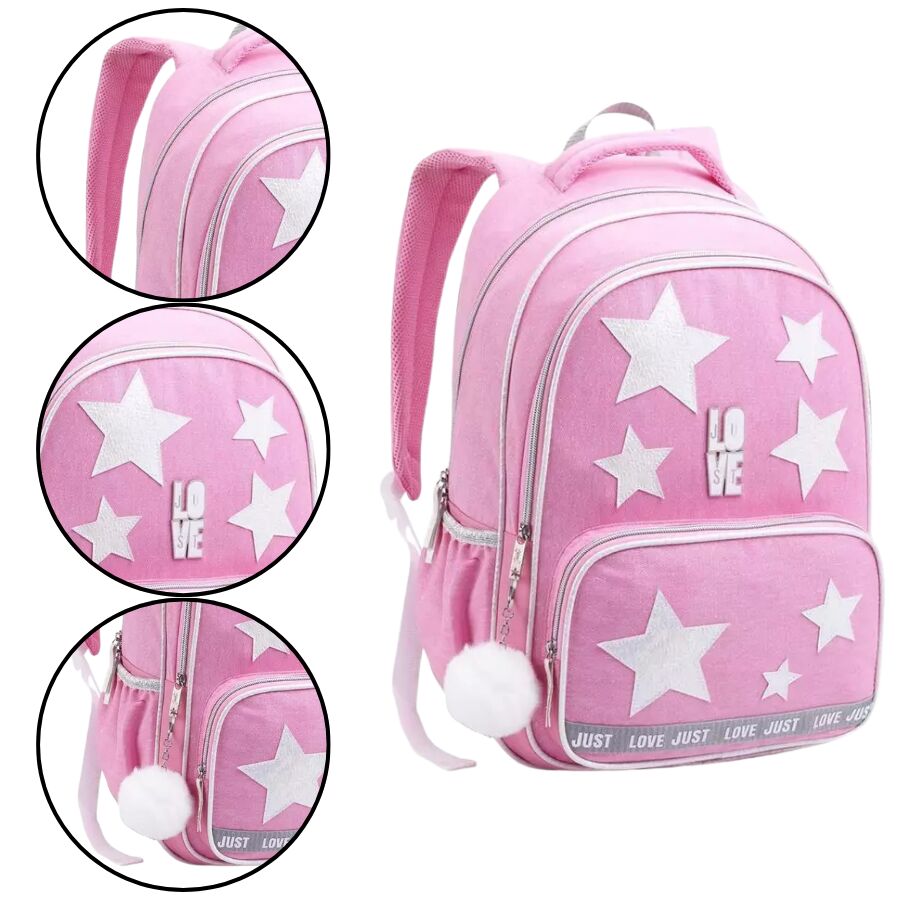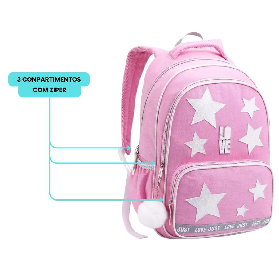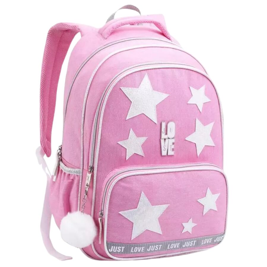 A mochila infantil estrela JT2128 traz um visual encantador com estrelas brilhantes, tom rosa vibrante e pompom decorativo, ideal para meninas que amam estilo e delicadeza. Com excelente espaço interno, múltiplos compartimentos e alças acolchoadas, é perfeita para o dia a dia escolar, oferecendo conforto, organização e muito charme.