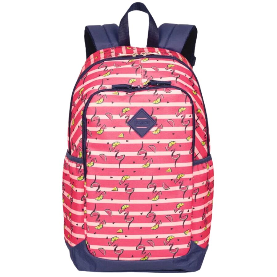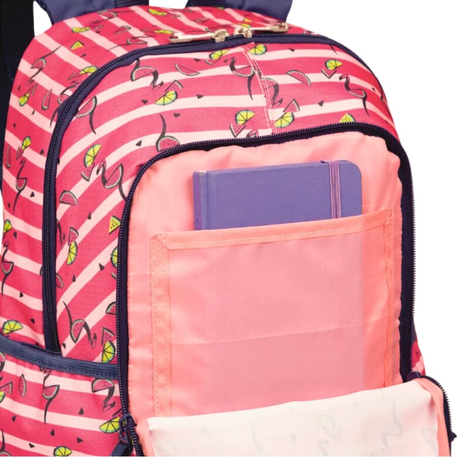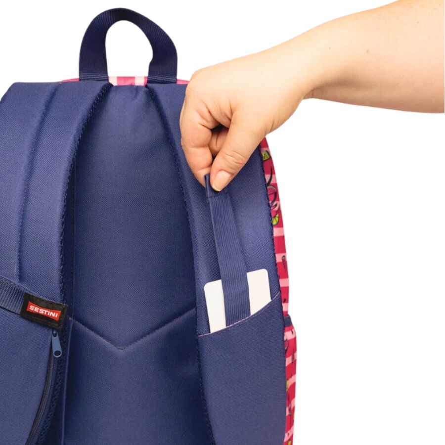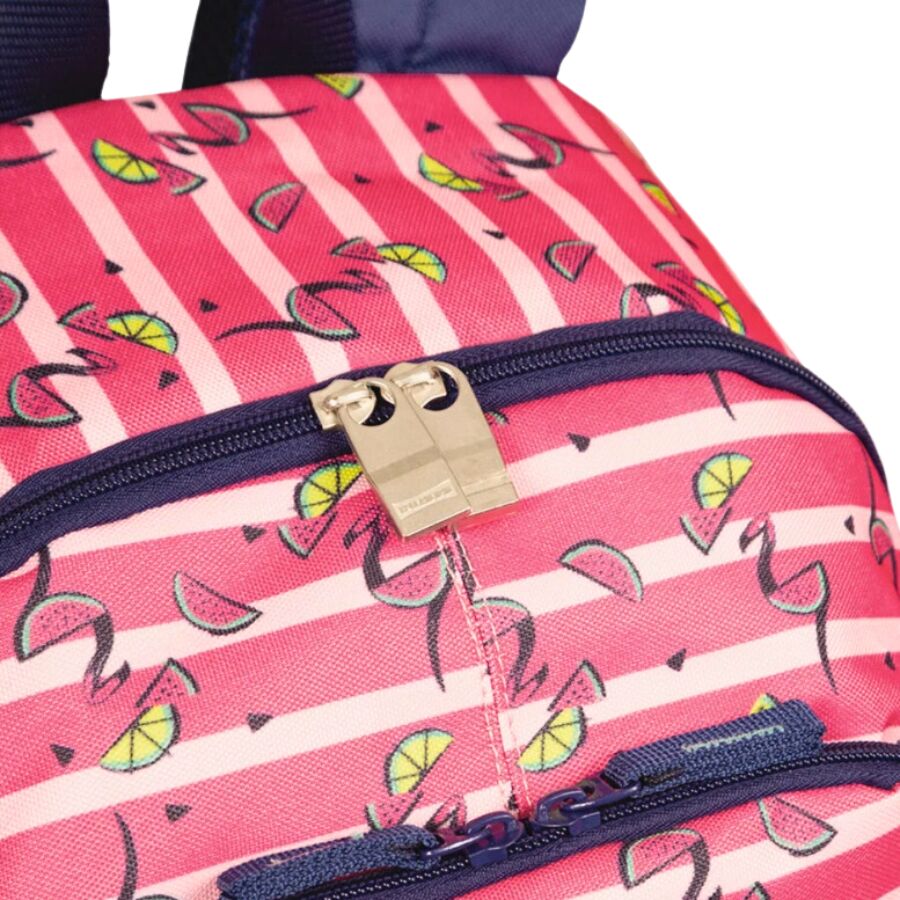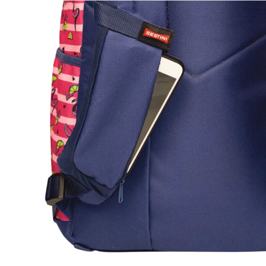 Inspirada na alegria do verão e no charme tropical, esta mochila da linha Sestini Magic traz uma estampa encantadora de flamingos e frutas tropicais, em tons vibrantes de rosa e azul marinho.