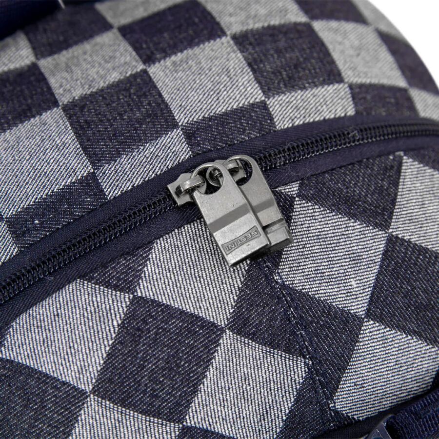 🖼️ Alt-text: detalhe do tecido jeans e zíper metálico da mochila-sestini-magic-jeans-xadrez-azul.