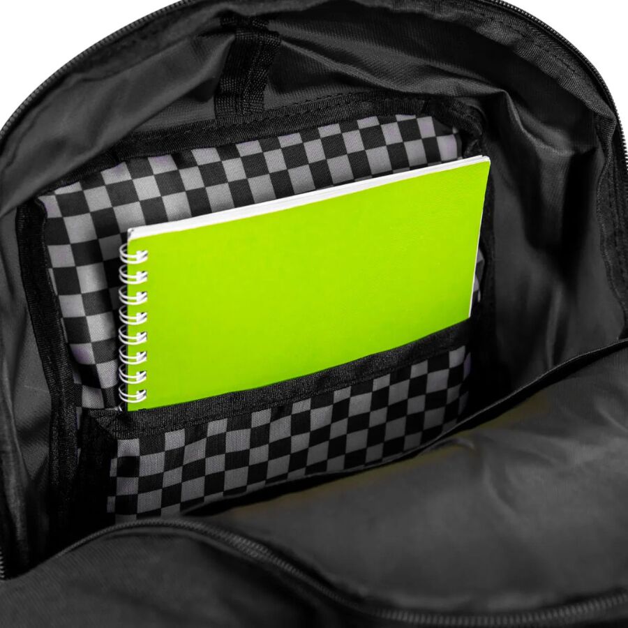 🖼️ Alt-text: compartimento interno da mochila-sestini-magic-nailon-xadrez-preto com divisórias e cadernos.
