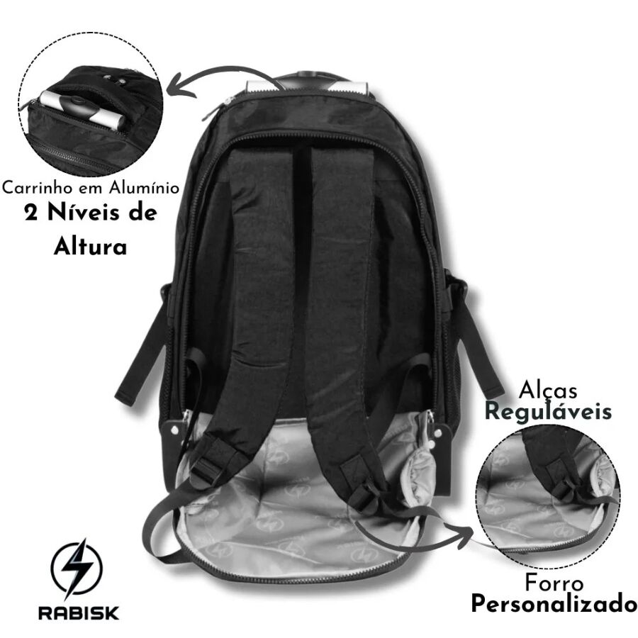 Além do transporte por rodinhas, a mochila preta de rodas conta com alças acolchoadas nas costas caso seja necessário carregá-la como mochila tradicional. Isso garante:
