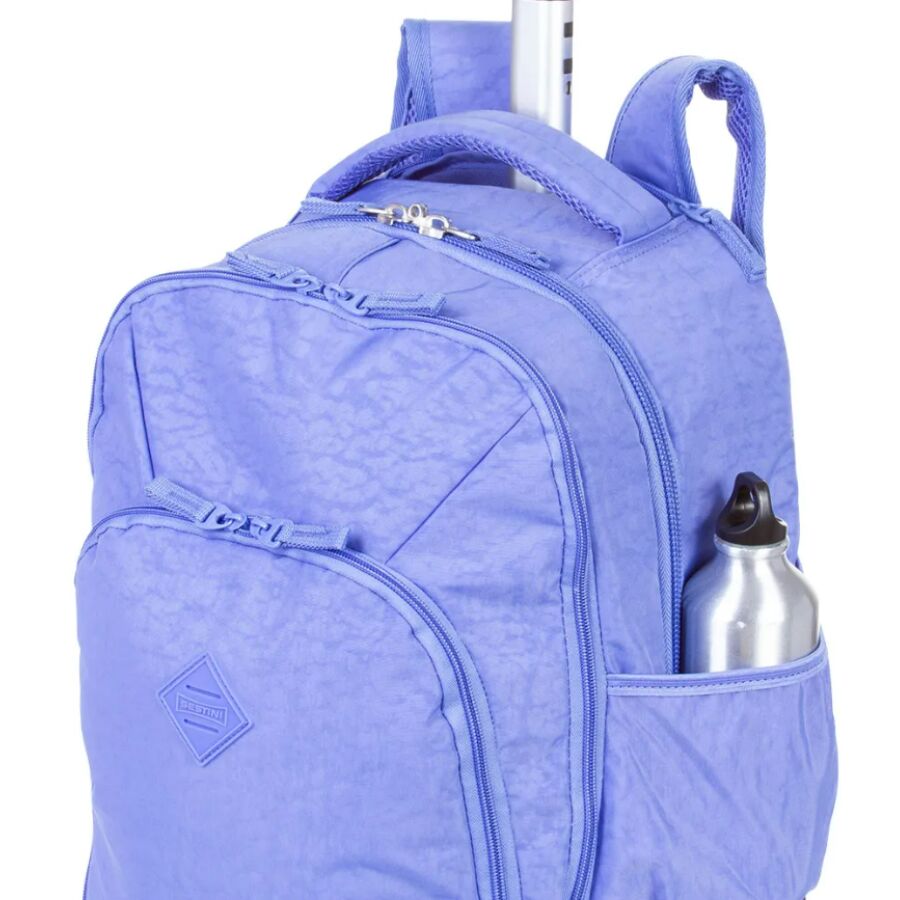 🖼️ Alt-text adicional SEO: Detalhe da Mochila Sestini Rolling Crinkle Lavanda com carrinho embutido e acabamento crinkle.