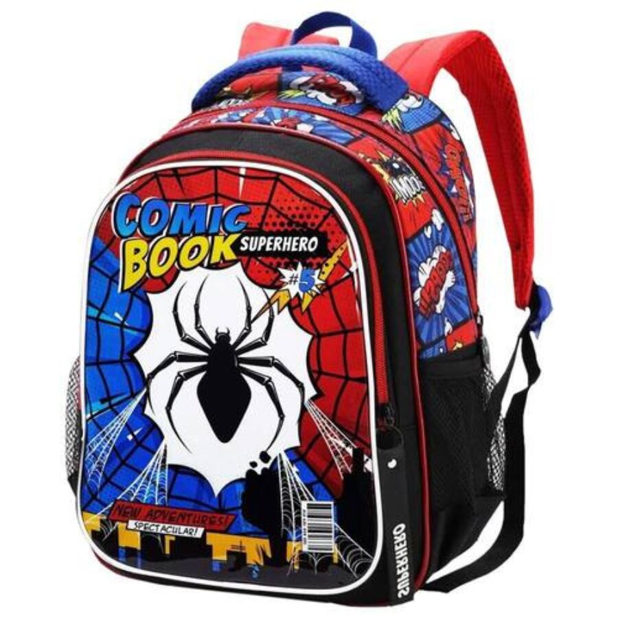 Um dos maiores destaques da mochila superhero infantil DL1821 é o seu design inspirado em quadrinhos. A frente estampada lembra capas de HQs clássicas, com cores fortes como azul, vermelho e preto, além de detalhes icônicos como teias, símbolos de heróis e traços que remetem diretamente ao estilo comic book.