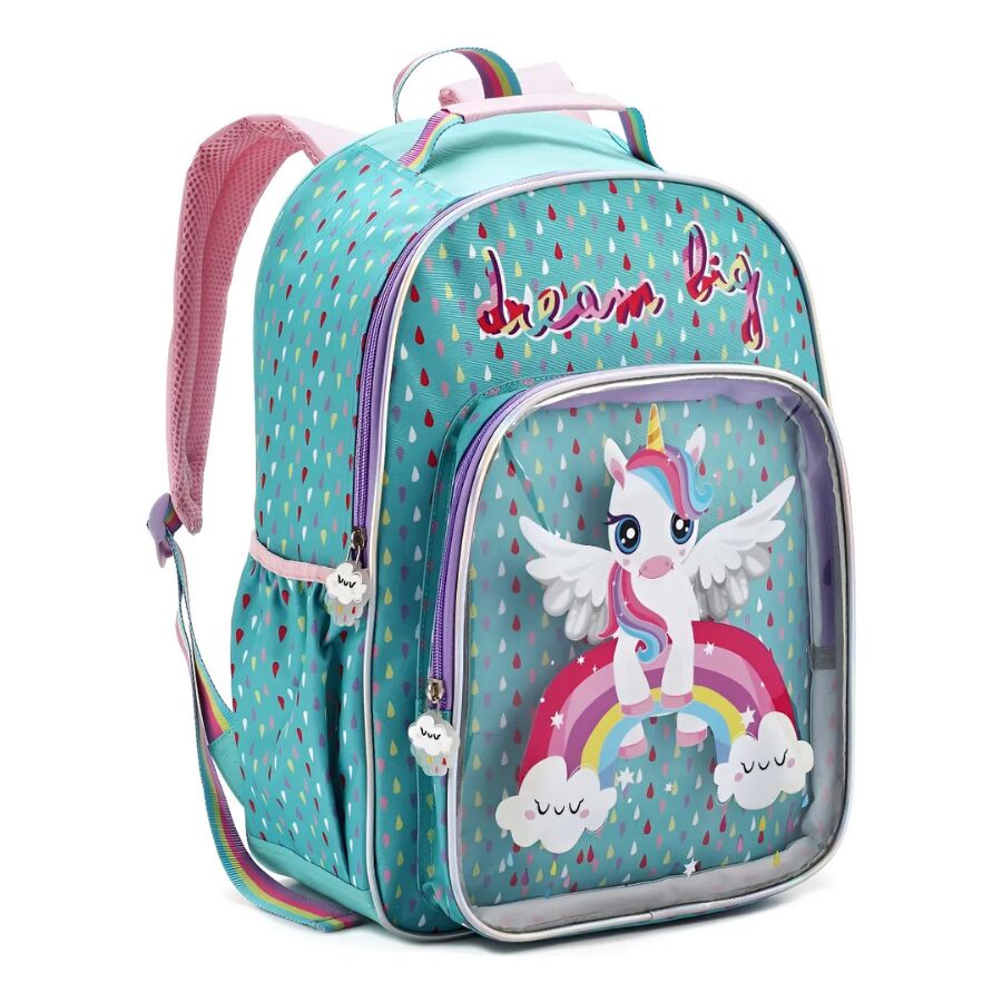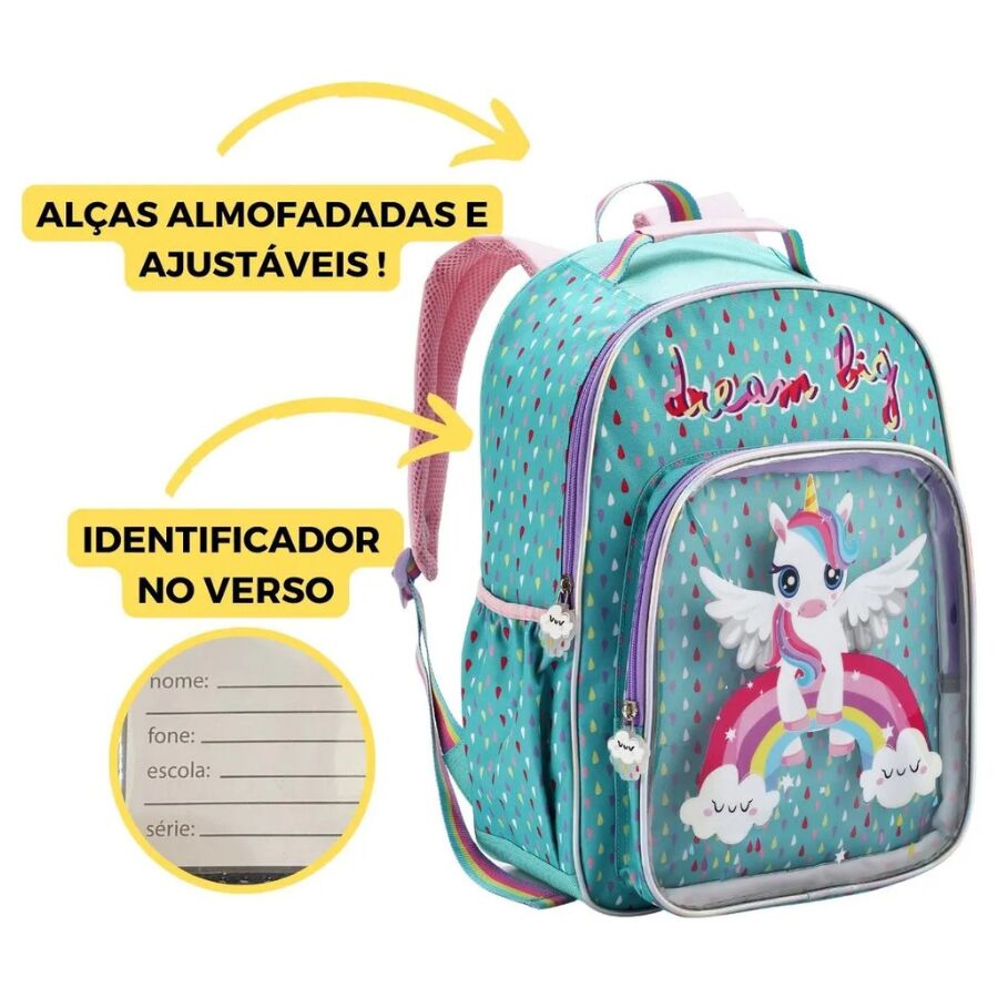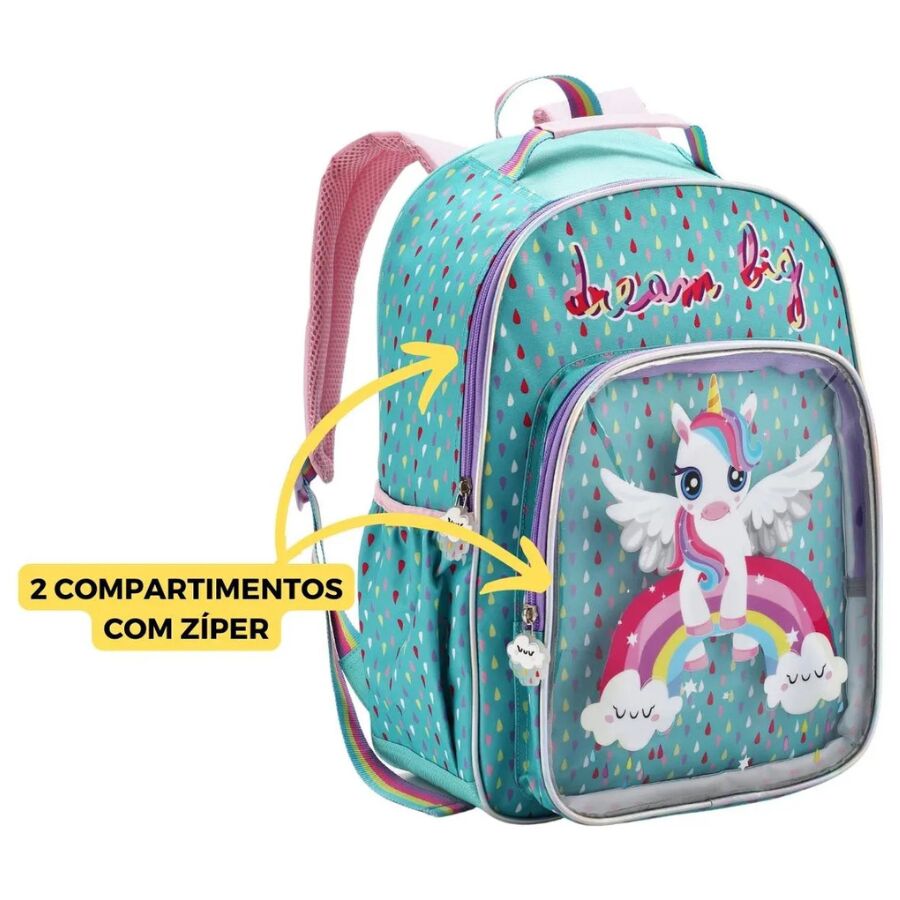 A mochila unicornio infantil Denlex DL1444 apresenta um design único inspirado em elementos mágicos. O unicórnio central se destaca pela expressão alegre e pelas asas abertas, transmitindo movimento e fantasia. O fundo verde água combina com gotas coloridas que deixam o visual ainda mais vibrante.
