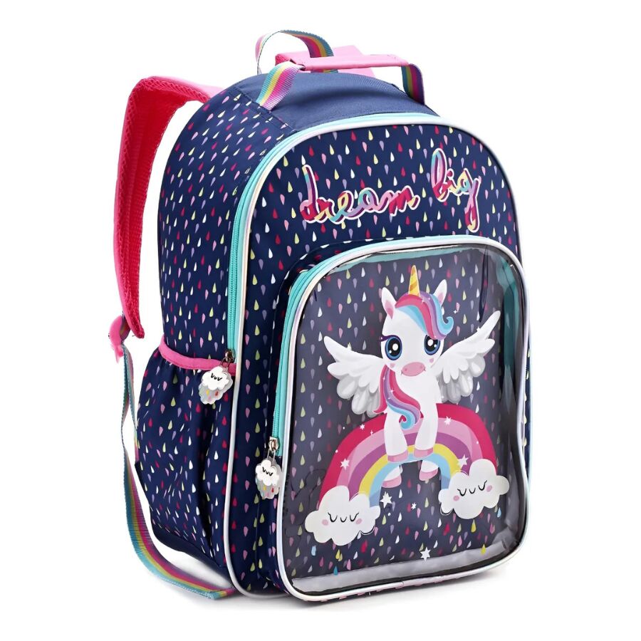 A mochila unicornio infantil Denlex DL1444 é leve, espaçosa e feita com materiais resistentes. Seu design temático com arco-íris e unicórnio encantado agrada imediatamente, tornando-se uma das favoritas entre meninas em idade escolar.