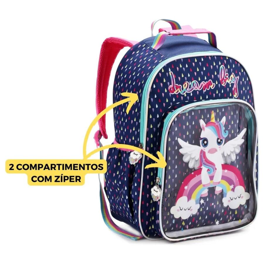 A mochila unicornio infantil Denlex DL1444 é a escolha perfeita para meninas que amam cores vibrantes, personagens mágicos e mochilas confortáveis para o dia a dia escolar. Com um design encantador que destaca um unicórnio voador sobre um arco-íris, o modelo chama atenção pela estética alegre, pela combinação de tons pastéis e pelo acabamento impecável. Fabricada pela Denlex, marca conhecida pela resistência e qualidade dos seus produtos, esta mochila se destaca tanto pela beleza quanto pela funcionalidade.
